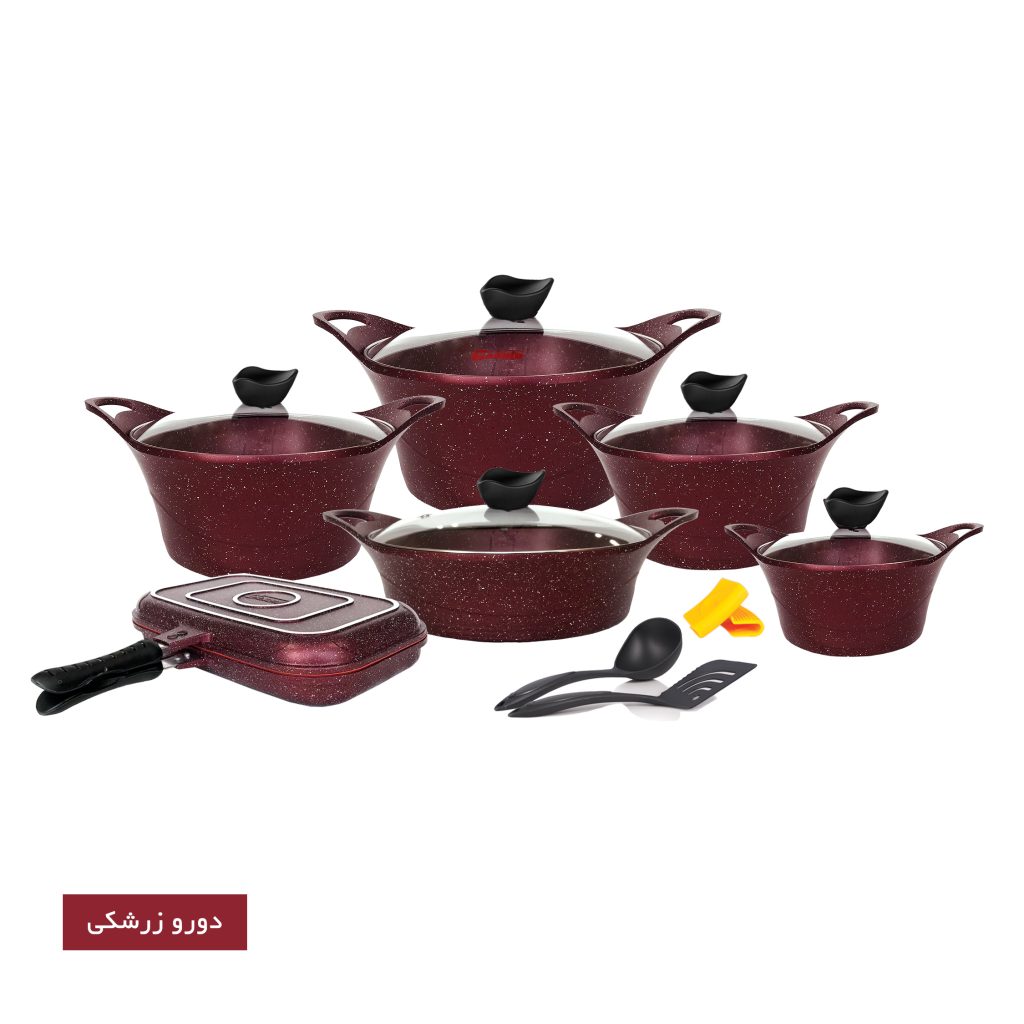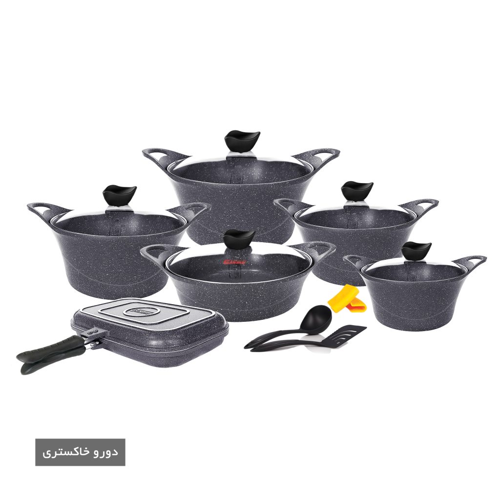 سرویس 15 پارچه کاپری (گرانیت) - درب پیرکس مجموعه ای کامل از وسایل پخت و پز آشپزخانه است. این سرویس شامل انواع قابلمه و تابه با اندازههای مختلف است. روکش این سرویس پخت و پز از گرانیت است و ضخامت مناسبی دارد که باعث بهبود عملکرد در پخت و پز میشود. این سرویس شامل اقلام زیر میشود: