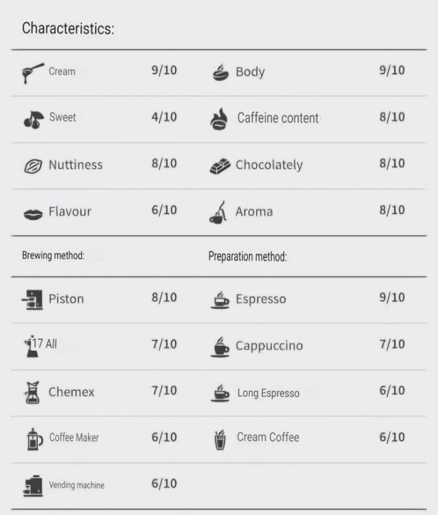 اسپرسویی که از این دانه ها عصاره گیری میشود، رایحهای فوقالعاده معطر دارد. طعم و مزه آن با شدت و لذت و ماندگاری بالا تکلیف عاشقان قهوه را روشن می کند. علاوه بر این، پایداری فوقالعاده کرما به لطف ۲۰٪ دانه های مرغوب روبوستا، شگفت انگیز است و بافت دلپذیری دارد. قهوه دنسی کلاسیک با شیر فوم شده نیز ترکیبی خوشمزه برای انواع لاته، کاپوچینو یا ماروچینو ایجاد می کند.