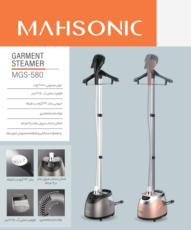 بخارگر ایستاده ماهسونیک، از محصولات معتبر لوازم خانگی میباشد.دیگر نگران اتو کردن لباس و پرده نباشید. عملکرد بخارگر ماهسونیک، به این شکل است که آب داخل مخزن دستگاه گرم شده و به بخار تبدیل میشود؛ این بخار سپس از طریق سری بخارگر به لباس انتقال مییابد و الیاف پارچه را نرم کرده و چروکها را از بین میبرد.